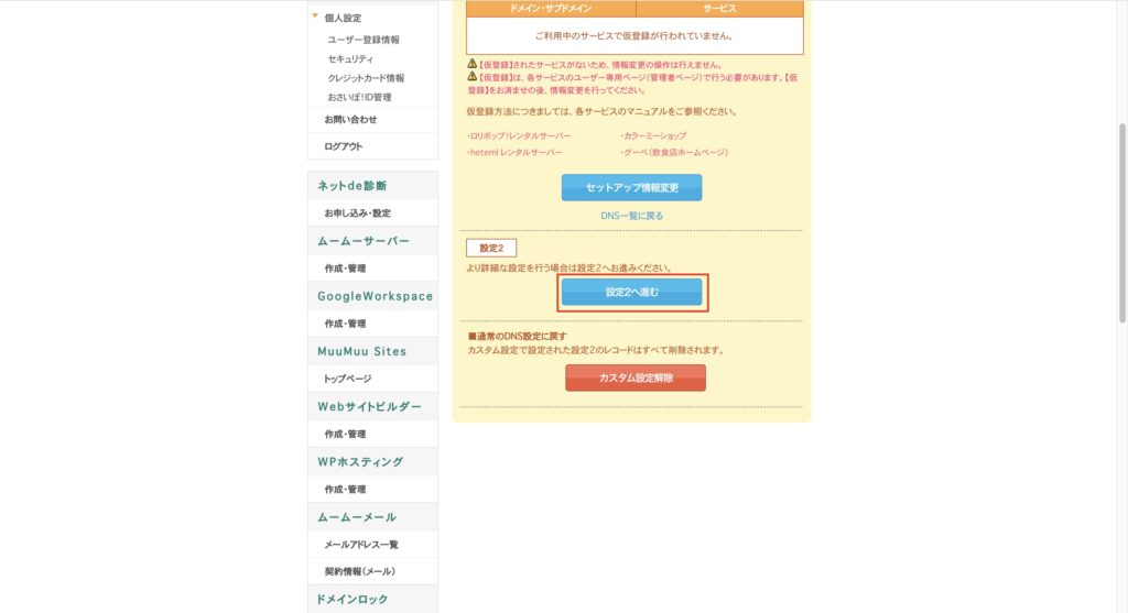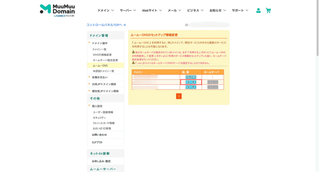 2. 「処理の変更」ボタンをクリック(ムームードメインの例)