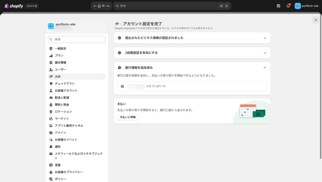 全て入力すると、下記の画面になります。これで、Shopifyペイメントの設定は完了です。Shopifyペイメントについては、今後解説記事を投稿しますので少々お待ちください。