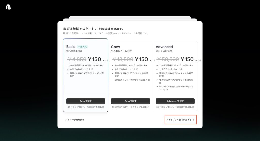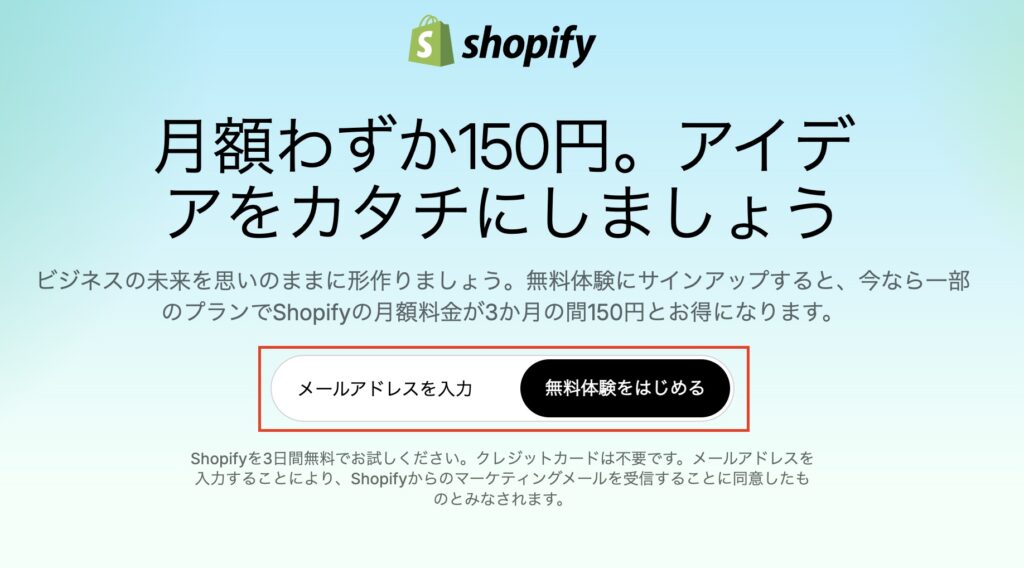 Shopifyの公式サイトから「無料体験を始める」をクリックし、メールアドレスを入力してアカウントを作成します。アカウント作成後は3日間の無料トライアルが開始されます。