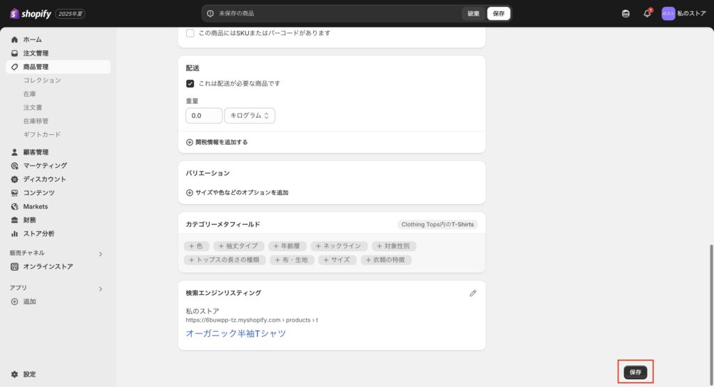 画面を下にスクロールすると、保存ボタンが表示されているので、保存を行います。これで商品の追加は完了です。