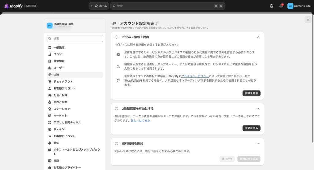 全て入力すると、Shopifyペイメントの設定は完了です。