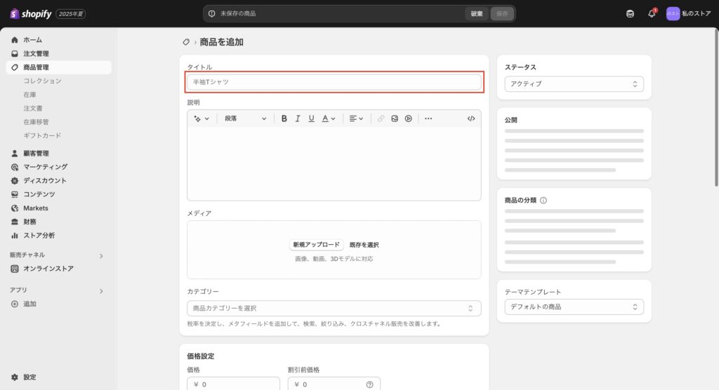 すると、商品の追加画面に移動します。初期設定を完了するだけであれば、最低限タイトルのみ入力すれば大丈夫です。